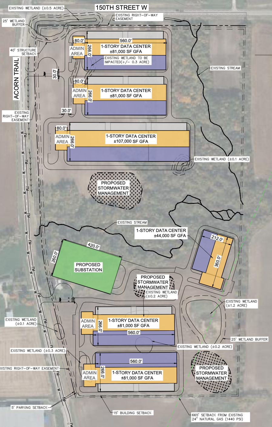 Conceptual campus plan features 500k square feet of single story data hall capacity